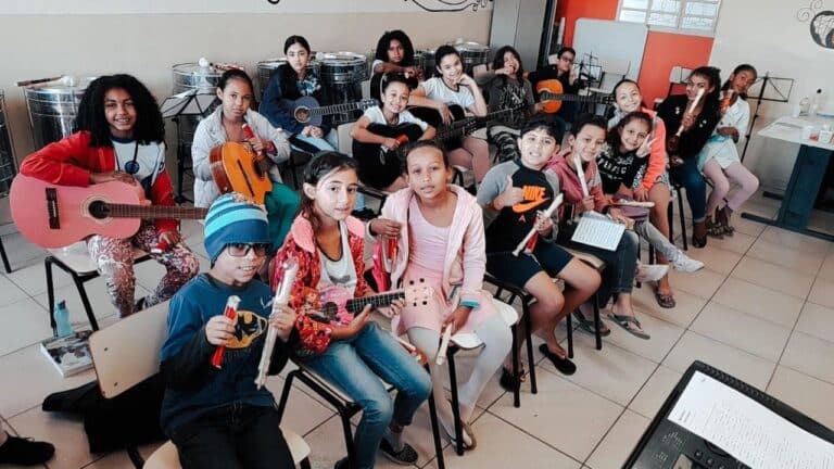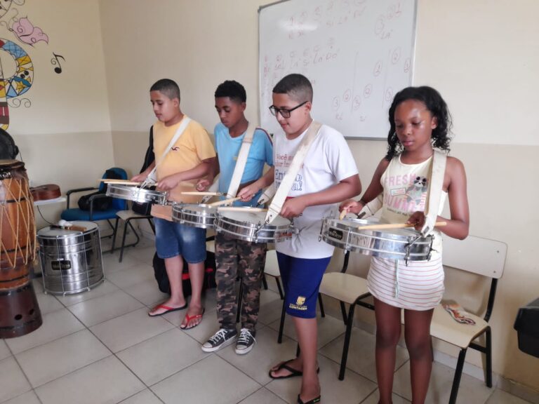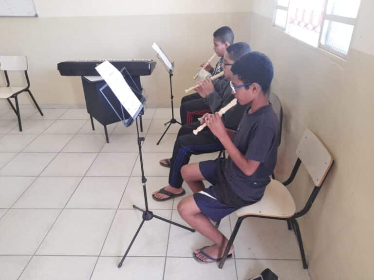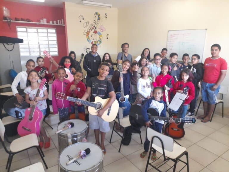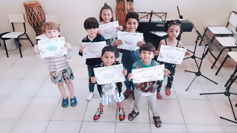 A oficina de Musicalização oferece vivências musicais centradas em aspectos rítmicos, melódicos e harmônicos, aplicadas a diversos instrumentos, como violão, flauta, teclado, percussão, ukulele e escaleta. Essas experiências permitem que as crianças explorem as possibilidades de cada instrumento, desenvolvendo habilidades para tocá-los ao compreender as nuances rítmicas, melódicas e harmônicas que cada um pode oferecer. Além da descoberta individual, as crianças também aprendem a integrar os instrumentos tocando em duplas, trios, quartetos e quintetos. Isso proporciona uma compreensão tanto do potencial de cada instrumento quanto da riqueza do trabalho coletivo. O objetivo geral da oficina é promover a consciência musical e cidadã através da música e sua diversidade.